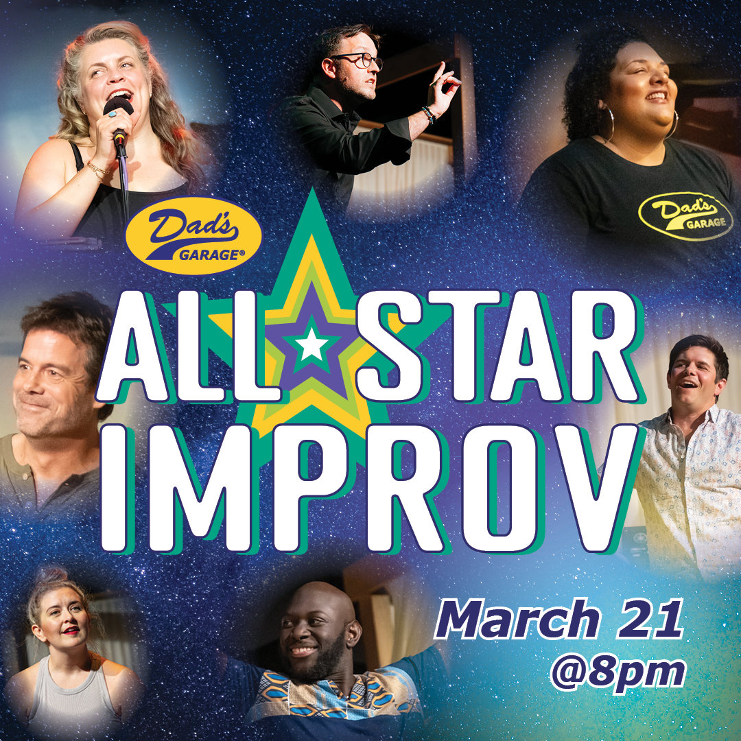 It’s a star-studded night of hilarity and improv comedy—our theatre is the dark canvas of the night sky, the Dad’s Garage ensemble are the stars, and you, dear patrons, are our universe! All Star Improv is a phenomenal showcase of our most skilled improvisers performing at their best to bring you an evening of hilarity you won’t have anywhere else, and with talent that can’t be cultivated anywhere else.