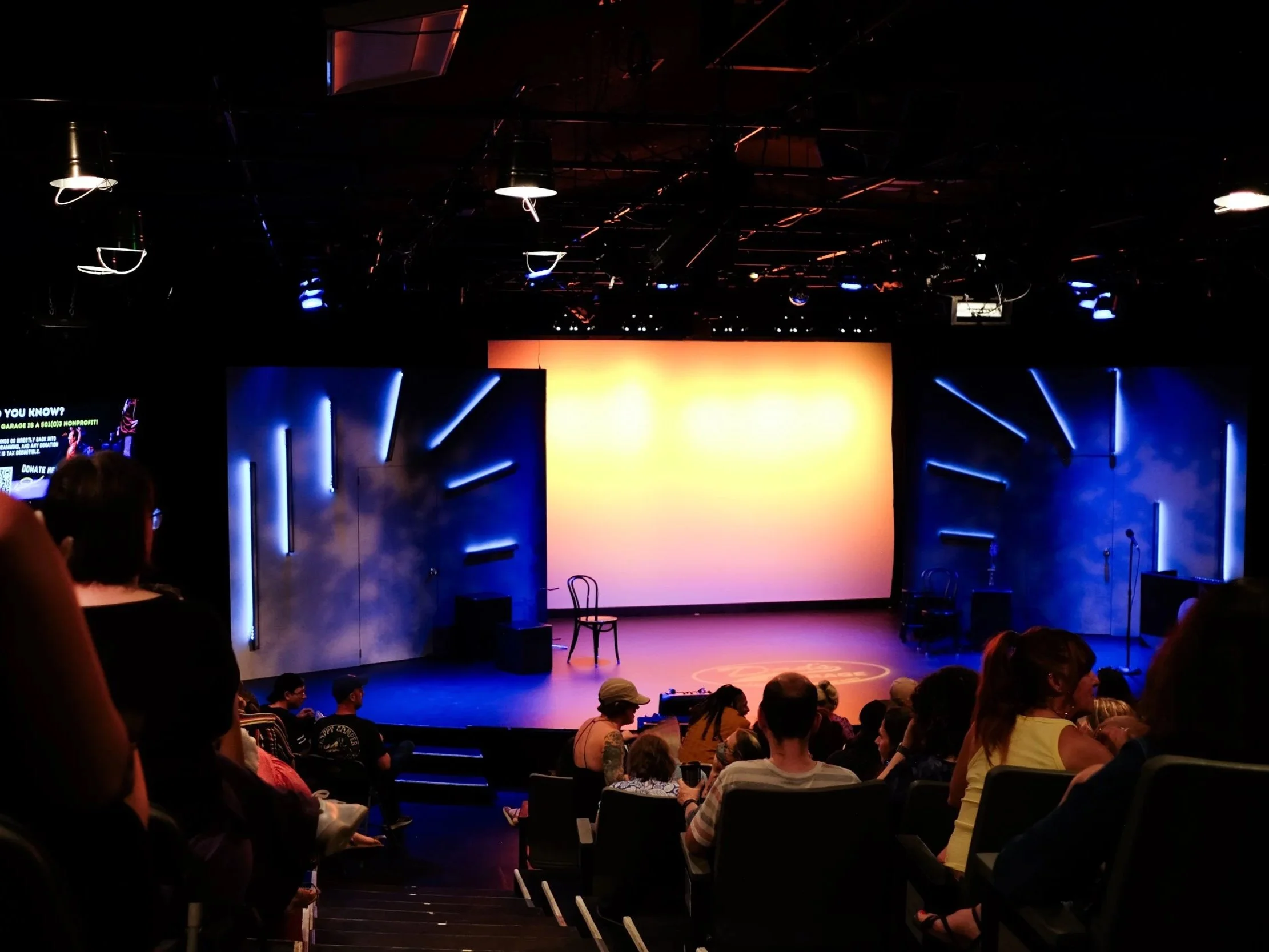 The Dad’s Garage lobby includes multiple screen displays, including one located immediately to the right of the stage.